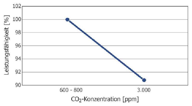 Sehr hohe CO2-Konzentrationen rufen Kopfschmerzen und Übelkeit hervor. CO2-Konzentrationen über 1.000 ppm stellen jedoch immer auch eine Beeinträchtigung der Leistungsfähigkeit dar.